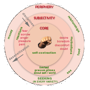 Emphasis on ever greater depth. Also includes the primary purpose of devotional groups: identifying lapses in radical devotion — in other words, things that cause one to fall out of the core and "fly" to the subjectivity layer or the periphery, and take on counter-egoic disciplines aimed at keeping one in the core. (When The Tiger Disappears)