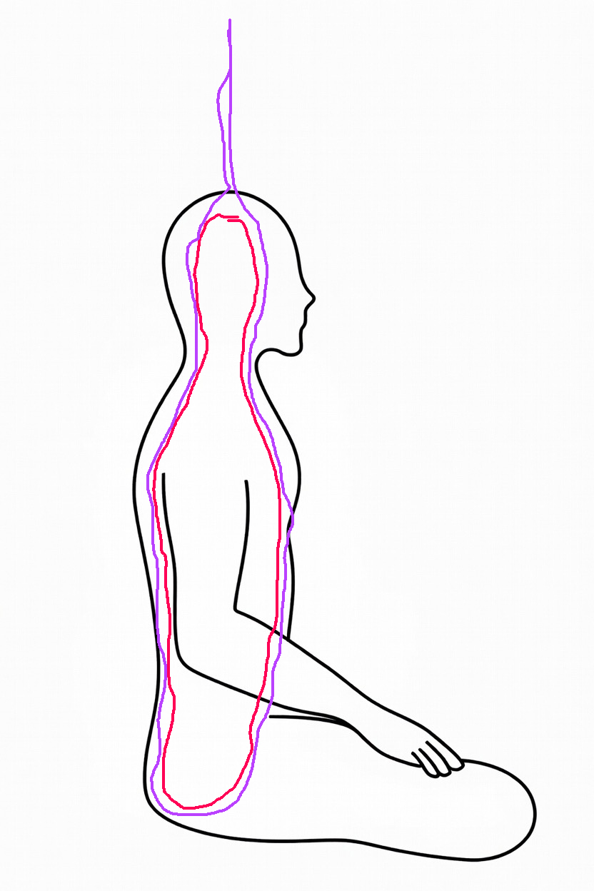 The Adidam practice of conductivity involves two circuits that overlap (see diagram below): the circuit of natural energy around the circle in the body-mind (red); and the much larger circuit of Divine Spirit-Blessing, that starts with the Divine infinitely above the head, descends down to the head, then down the frontal line, then up the spinal line, then returns to the Divine, infinitely above the head (purple). The two circuits overlap in the body-mind, where we are conducting both the natural energy of the body and the Divine Spirit-Blessing.