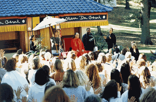 In 1995, Adi Da appointed Ed Rahsman and myself to be the co-heads of Adi Da's Lay Renunciate Order, a group of devotees committed to intensive practice and intensive service to Adi Da's Work of liberating all beings. It was a great responsibility, that was accompanied by some very special moments. For instance, on the day of this story, as Adi Da walked out from His Residence, The Manner Of Flowers, at the Mountain Of Attention Sanctuary, on His way to grant Darshan to His devotees, He stood still for a moment as I took a specially prepared lei made of flowers, and placed it around His neck. An extraordinary, unforgettable moment for a devotee! Then as Adi Da walked to Paduka Mandir, the Temple where the Darshan occasion would take place, I met up with a special visitor I would be hosting for the occasion. I'll call him "John". He was a very well-known Hollywood movie actor, on the "Hollywood A-List" throughout the 1980's and 1990's, and immediately recognizable by almost anybody who watched movies. John had somehow heard about Adi Da and very much wanted to receive His Darshan. So I escorted John to the Darshan occasion, where we sat and received Adi Da's Darshan for the next thirty minutes or so. The picture below is from a very similar occasion in front of Paduka Mandir in 1995.