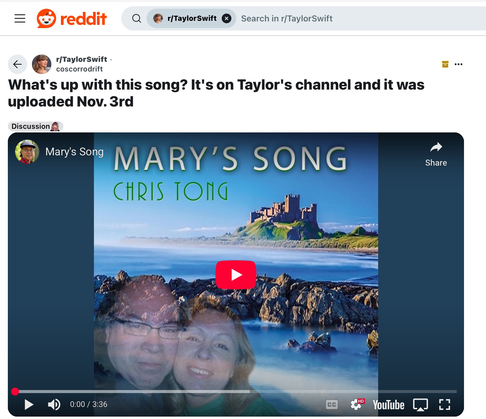 Taylor is always reinventing herself, exploring new musical genres, and always surprising, teasing, and sometimes even playfully misdirecting her fans. So for many of them, “Chris Tong” and “Mary's Song” were part of some mysterious, new game she was playing with them. . . a new puzzle or “Easter Egg” she was giving them to delight in and figure out. I’m relieved to say that the feedback in the comments about my song and me (which included some of my other released songs too, which her fans had tracked down, detective-style) was uniformly positive. And this was even after the fans began to realize it wasn’t a "Taylor surprise", but some kind of improbable YouTube mix-up, and "Chris Tong" was a real songwriter!