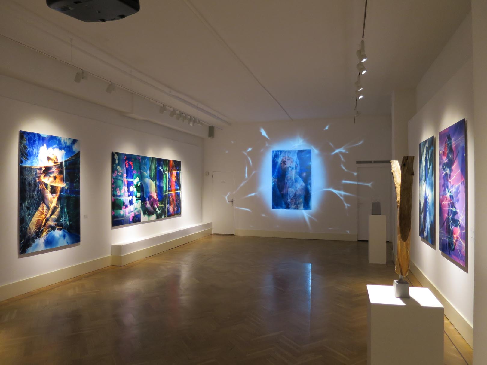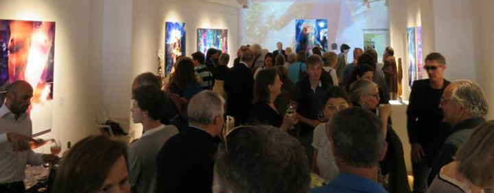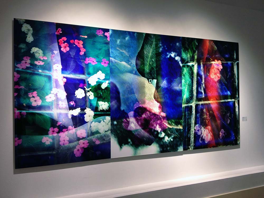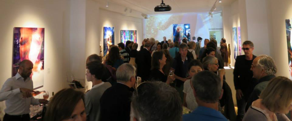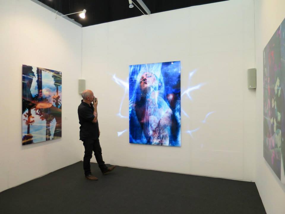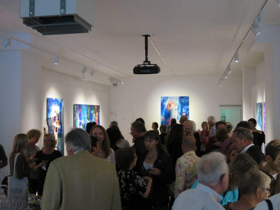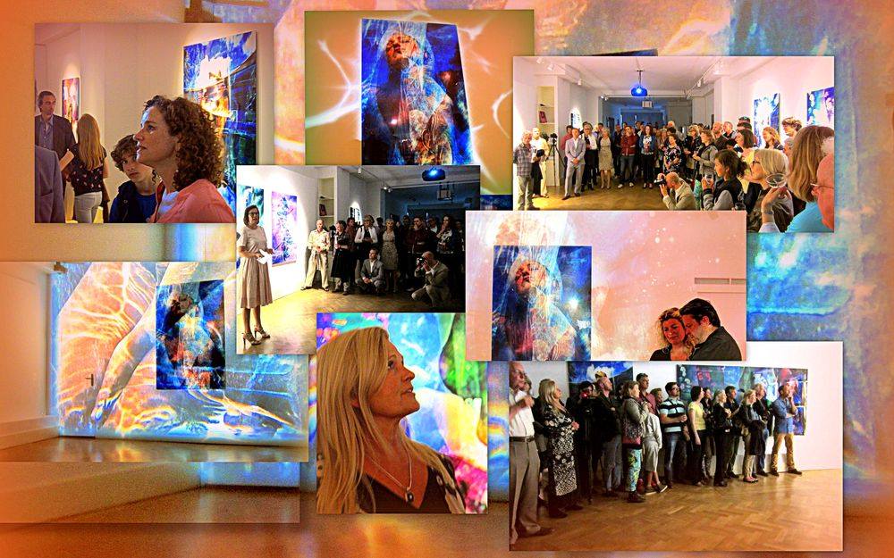 The multi-media projection installation fills the back wall of the gallery, and loops every eight minutes. The theme of the installation is also the subtitle of the exhibition: “The Indivisible Space of Conscious Light”. The exhibition art works are featured in the multi-media installation, and are presented in a manner that conveys the artist’s message that the imagery, and in fact the entire world, exists in an “Indivisible Space of Conscious Light”.