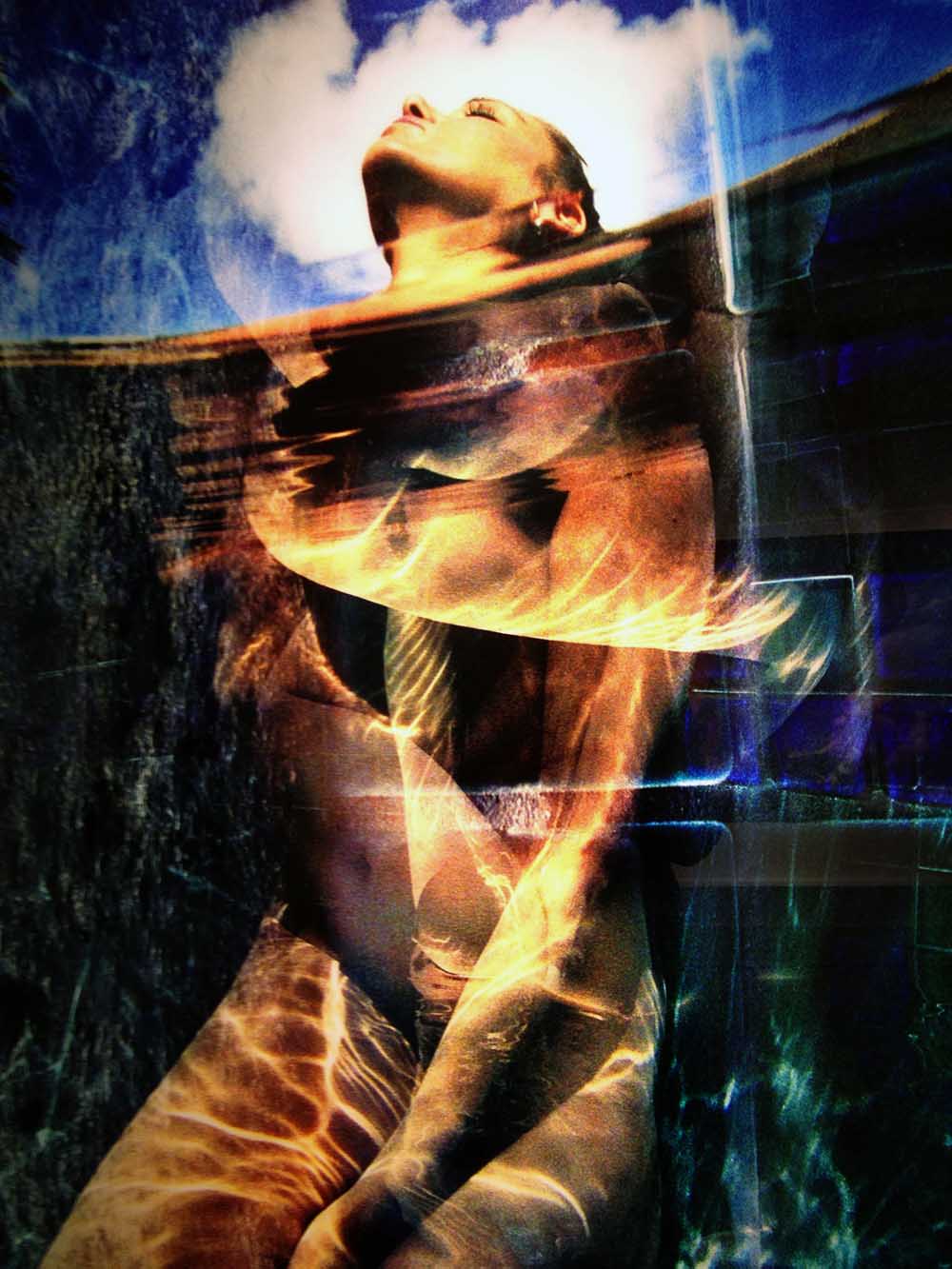 Quandra Loka — a suite of interrelated photographs with a single overarching subject matter — was created by Adi Da in 2002-2003. Quandra Loka represents the pinnacle of Adi Da's photographic method. Almost all of the images in this suite are complex multiple exposures, typically involving more than two (and even as many as ten or more) superimposed layers. He created each of these multi-exposed images entirely in camera, mostly underwater, without the use of artificial lighting and the aid of any digital or darkroom manipulation. As a result, His works are of a contemplative and enigmatic character.