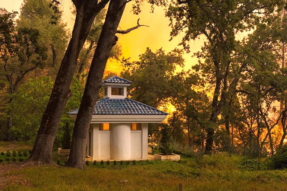 combination of Adi Da's Grace (which had actively and miraculously prevented a previous fire in 1979 from encroaching upon the Sanctuary), a vigorous forestry management program (that
