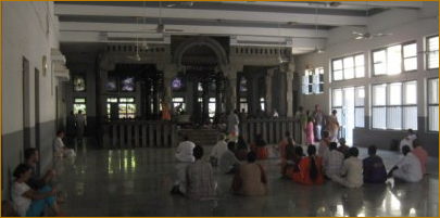 | We arrived at Ramana Maharshi's Ashram Sri Ramanashram, early the next evening after a full day of travel. . . . We were shown to a private room across the street from the main Ashram grounds where we put our bags, and immediately Bubba left for the Satsang hall where Bhagavan's Mahasamadhi site was. It was a large room with a large black shrine at the front. A white marble platform indicated where Ramana was buried. Bubba walked around the shrine three times as is the custom, then bowed in front and sat on the floor. We stayed for about an hour and returned to our room. He said the Satsang hall was a very powerful place, that as soon as he entered it he was taken over with this incredible force. He said Ramana was the Heart and his force could be felt in the Heart to the right of the chest. Bubba told me Ramana's realization was the same as his, and that he also directly felt the ascension of force from the Heart to the sahasrar in that room. "The Trip To India: Taxis, Temples, and God" Dawn Horse Magazine, Vol. 2, No. 2, August 1974 |  shrine built above Ramana Maharshi's tomb