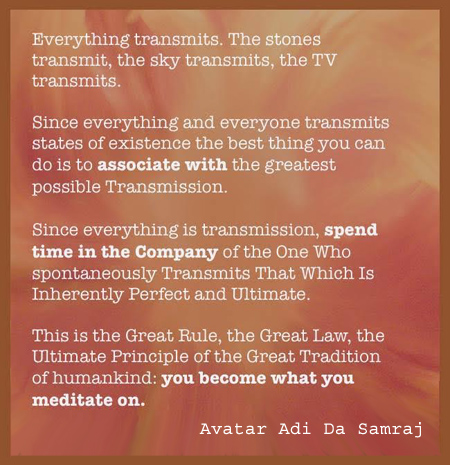 So the first form of helpful discrimination we can offer is this: If you run across a web page that makes all kinds of controversial allegations about Avatar Adi Da or Adidam but fails to mention the hundreds of stories of people experiencing Avatar Adi Da's Divine Transmission (some of which you can read on this website), know immediately that there is nothing objective about that web page, and that it is not capable of providing anything like an accurate account of Avatar Adi Da because the author of the web page does not acknowledge (and may not even be aware of) the reality of Spiritual Transmission Masters.