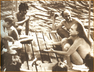 ![]() Adi Da with Aniello and other devotees on the platform in the middle of Mother's Bed (at the Mountain Of Attention Sanctuary) July 7, 1982 | ||