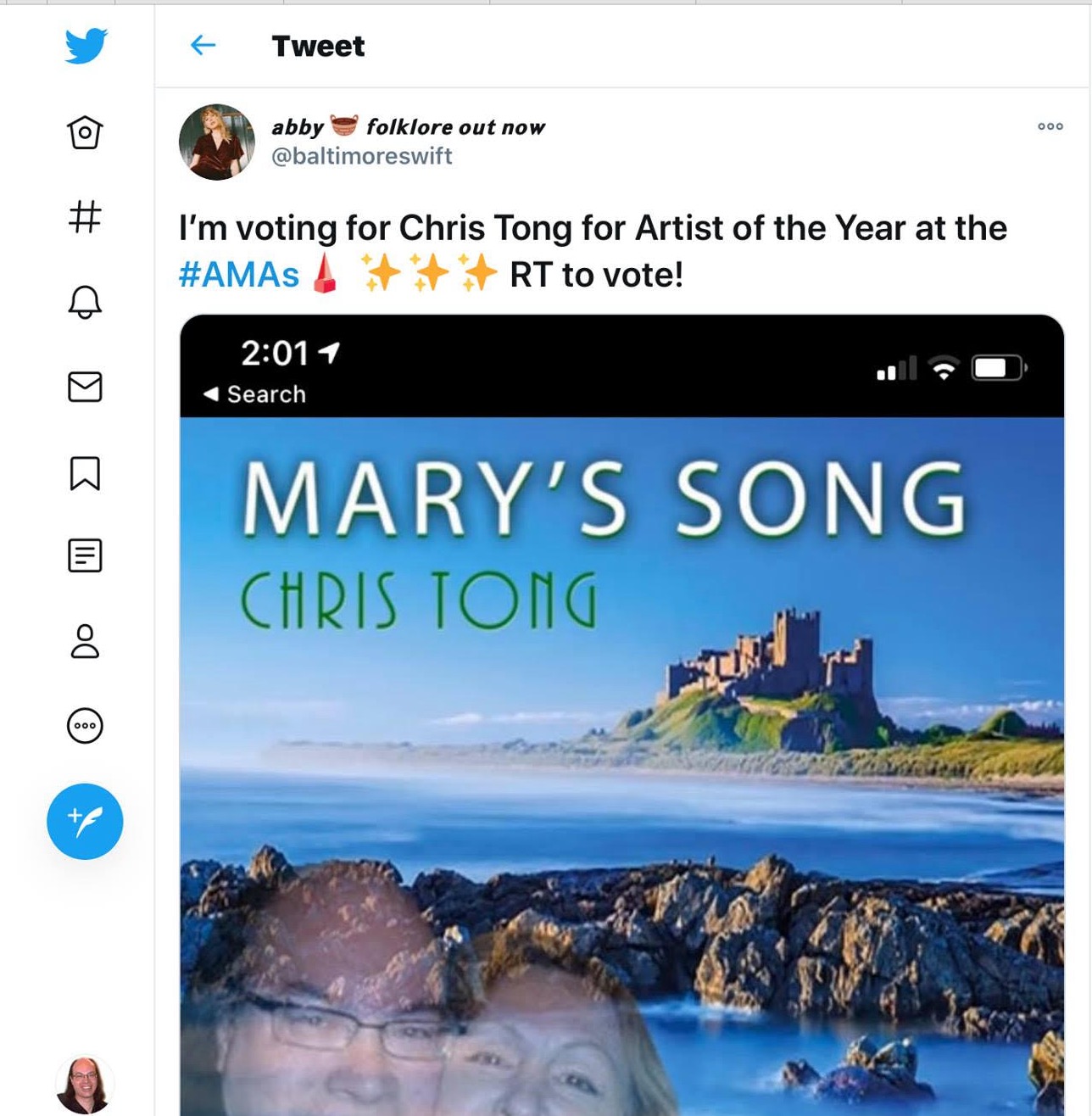 abby folklore out now: "I'm voting for Chris Tong for Artist of the Year at the American Music Awards."