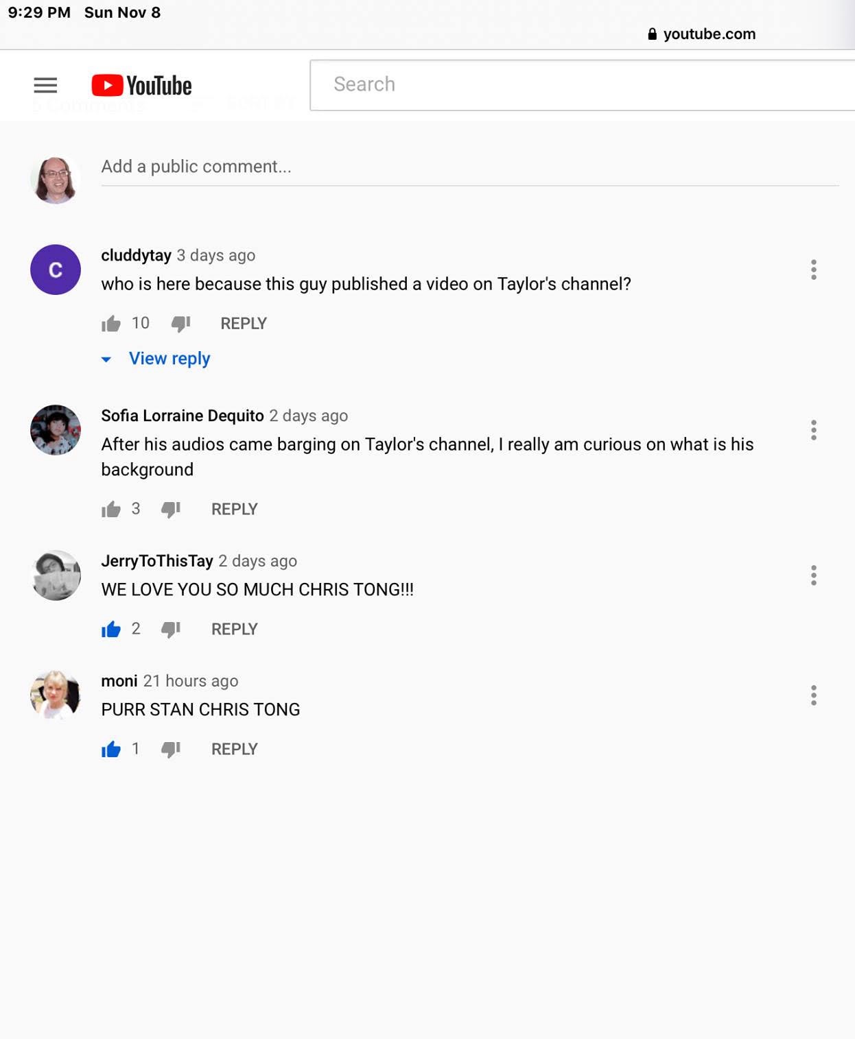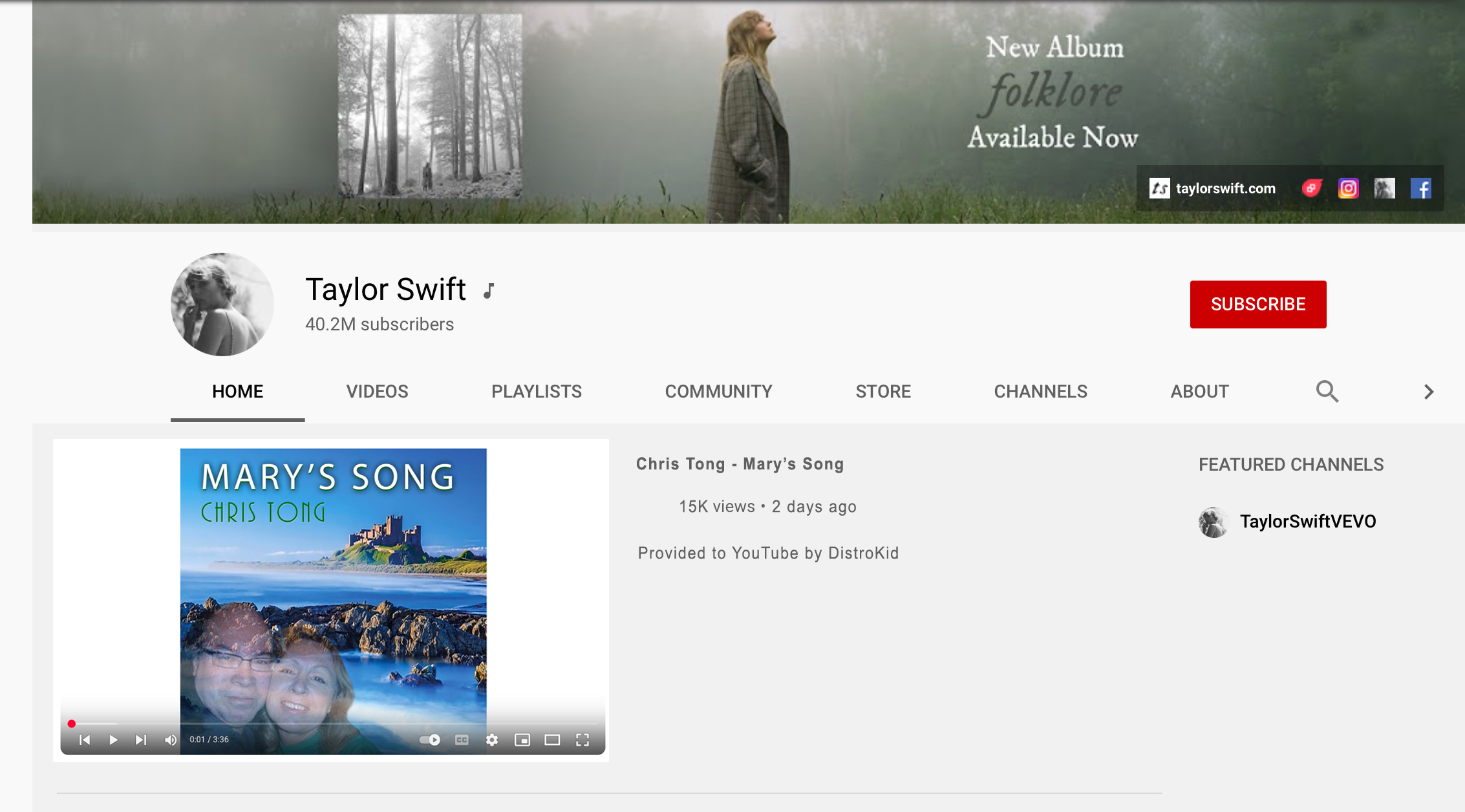Taylor is always reinventing herself, exploring new musical genres, and always surprising, teasing, and sometimes even playfully misdirecting her fans. So for many of them, “Chris Tong” and “Mary's Song” were part of some mysterious, new game she was playing with them. . . a new puzzle or “Easter Egg” she was giving them to delight in and figure out. I’m relieved to say that the feedback in the comments about my song and me (which included some of my other released songs too, which her fans had tracked down, detective-style) was uniformly positive. And this was even after the fans began to realize it wasn’t a "Taylor surprise", but some kind of improbable YouTube mix-up, and "Chris Tong" was a real songwriter!