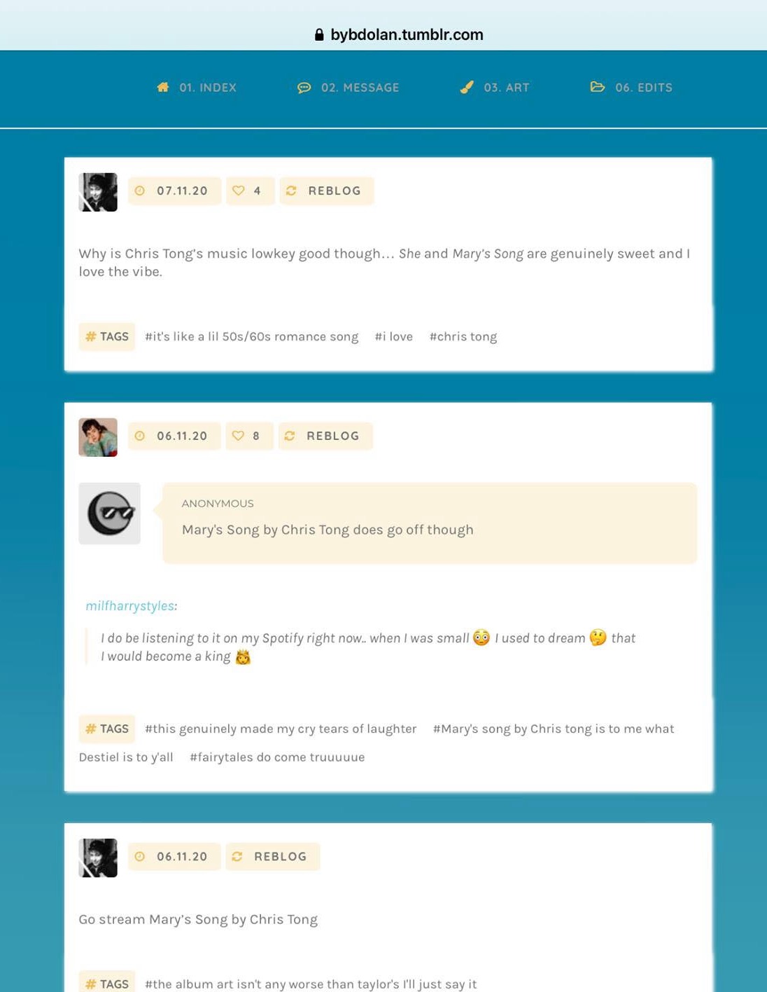 bybdolan: "Chris Tong music is lowkey good though. . . She and Mary's Song are genuinely sweet and I love the vibe. It's like a lil 50s/60s romance song. I love Chris Tong."