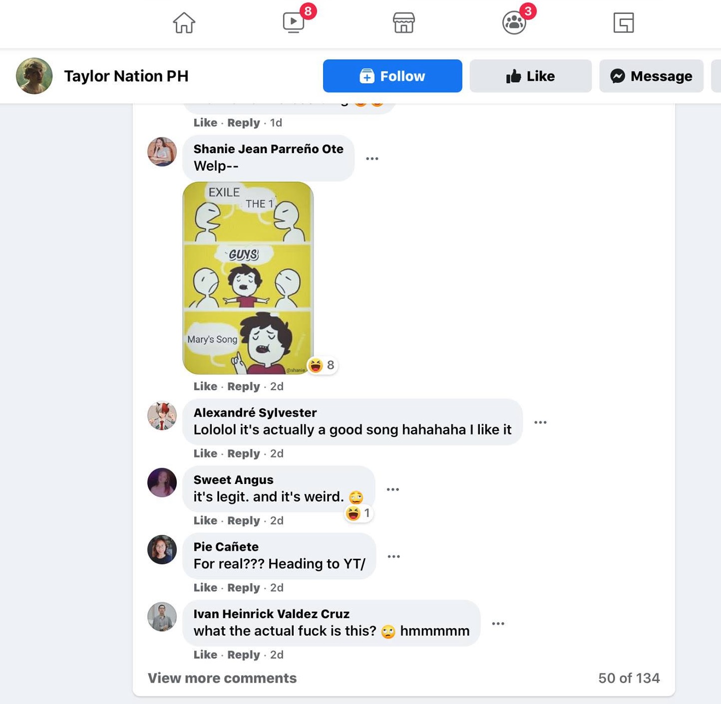 The fact that that video with the high number of views had been anticipated by Taylor's fans (because of pre-announcements from Taylor) no doubt contributed to the large number of views. In contrast, at the time my video appeared, Taylor was not posting any new videos herself and she was not expected to release another track or album any time soon, so no one was expecting my video. Even so, during the time my song was on Taylor’s page (about half a day), it was listened to by 20,000 of her fans (known as "Swifties"), liked by 1,100 of them, and commented on by 1,400 — on just the YouTube page. But there are also literally thousands of other Taylor Swift fan discussion groups, spread across every social network, including Taylor’s X/Twitter account (with 89 million followers in 2020) and her Instagram page (with 140 million followers in 2020). As word of the new video/song spread to all of them, they all were asking: “What IS this song?” “Who is Chris Tong?” “Is he a new musical partner of Taylor's?” “Is this a new direction her music is taking?” “Last year, she did a song/music video, The Man, where she made herself up to look like a man. . . is she now changing her voice too to a male voice?!” There were literally thousands of comments on the appearance of my song, spread across the Web!Responses. For the fun of it, I’ll post a few of these comments below (click on them to enlarge), from X/Twitter, Reddit, YouTube, Tumblr, and Facebook. I've included a red link (link to online post) where it is possible to still bring up the original comment out on the Web.