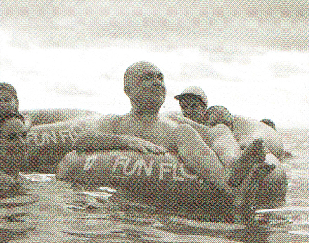 That morning, Adi Da was at the cove He had named "Lions Lap", because the island there was shaped like a great lion at rest (with the cove located right between the Lion's "paws"). He was enjoying a relaxing outing with His Gurukula — the Ruchiradamas and His daughters. He was floating on the water in the cove there in an inner tube, and the Gurukula were in the water surrounding Him.