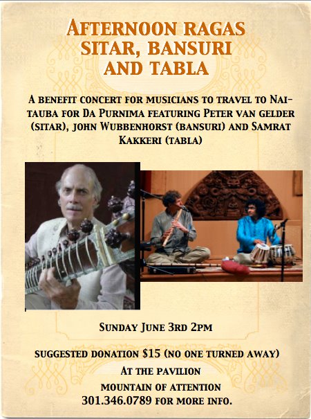 Peter van Gelder (sitar), John Wubbenhorst (bansuri), and Samrat Kakkeri (tabla) will perform a Sacred Offering of classical Indian ragas on 2pm on June 3, 2012, in Land Bridge Pavilion at The Mountain Of Attention.