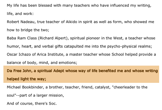 Enlightenment of the Whole Body While of course the most definitive way to know whether the Socrates character's quote was a paraphrase of Adi Da's words would be for Dan Millman himself to confirm it directly, such confirmation is not necessary; it's quite possible to be certain with a high probability, independent of the author's confirmation. Again, the example of Carlos Castaneda comes to mind. Castaneda always claimed that his "Don Juan" was a real Yaqui Indian, and that everything said or done by the character in the books was actually said or done by the real man. Indeed, on the basis of that claim, his books were originally labelled "non-fiction" — and they continue to be labelled "non-fiction" to this day (by Simon and Schuster, Castaneda's main publisher), amazingly enough, even after extensive debunking of their nonfictional status by Castaneda critics, most notably Richard De Mille. One of the primary means De Mille used was textual analysis similar to the textual analysis done in this article, through which Don Juan's words are traced back to other sources. In a 2007 Salon article, Robert Marshall wrote of De Mille: "His 1980 compilation, 'The Don Juan Papers', includes a 47-page glossary of quotations from don Juan and their sources, ranging from Wittgenstein and C.S. Lewis to papers in obscure anthrolopogy journals." After a few years of such extensive questioning, most reputable organizations (e.g., the New York Times) that had originally held Castaneda's books to be nonfiction no longer held that view, even though Castaneda himself never acknowledged it. We are writing this article to serve the same purpose for the Socrates quote — identifying Adi Da as its original source — even if Millman himself never acknowledges that source. * * * It's worth noting that Millman has continued to remember, respect, and quote Adi Da's teaching, even to this day. We now provide just a few examples to make the point. In his 1992 book, No